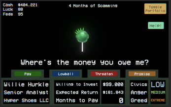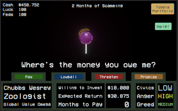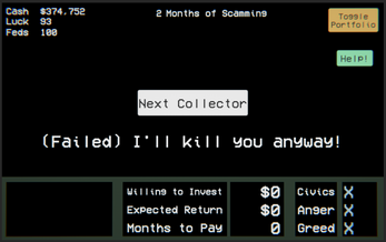 - If Lowball, Threaten, or Promise fails (roll versus the sucker's stat scores), they take a 10% cut now to come back later, rat to the feds, or try to kill you.